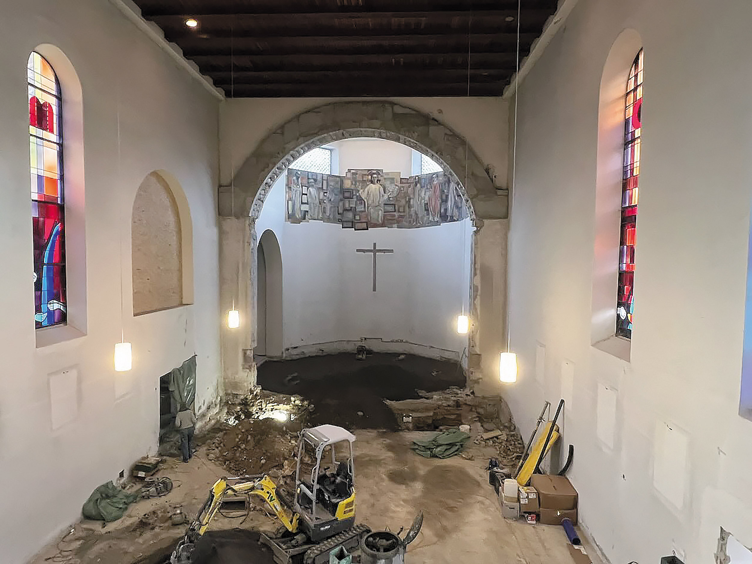 Viel hat sich in der Zwischenzeit schon getan, unter anderem wurden alle Bänke und Kunstschätze ausgeräumt, der Altar „in Sicherheit gebracht“, archäologische Grabungen durchgeführt, der Aufgang zur Empore abgebrochen, eine neue Tür aus der Seitenwand gefräst und der Chorbogen aufgeweitet. Bis zum Advent sollen sämtliche Baumaßnahmen abgeschlossen sein.