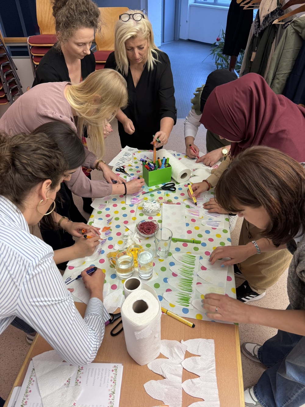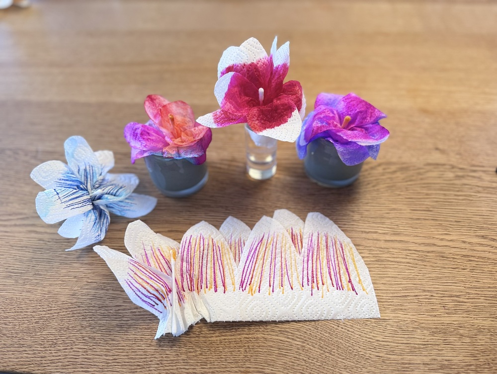 Kreativ wurden wir beim Basteln: Aus einfachen Materialien wie Küchen- oder Klopapier entstanden wunderschöne, bunte Blumen - ideal als kleine Aufmerksamkeit zum Muttertag oder als Abschlussgeschenk für die Eltern beim letzten Treffen.